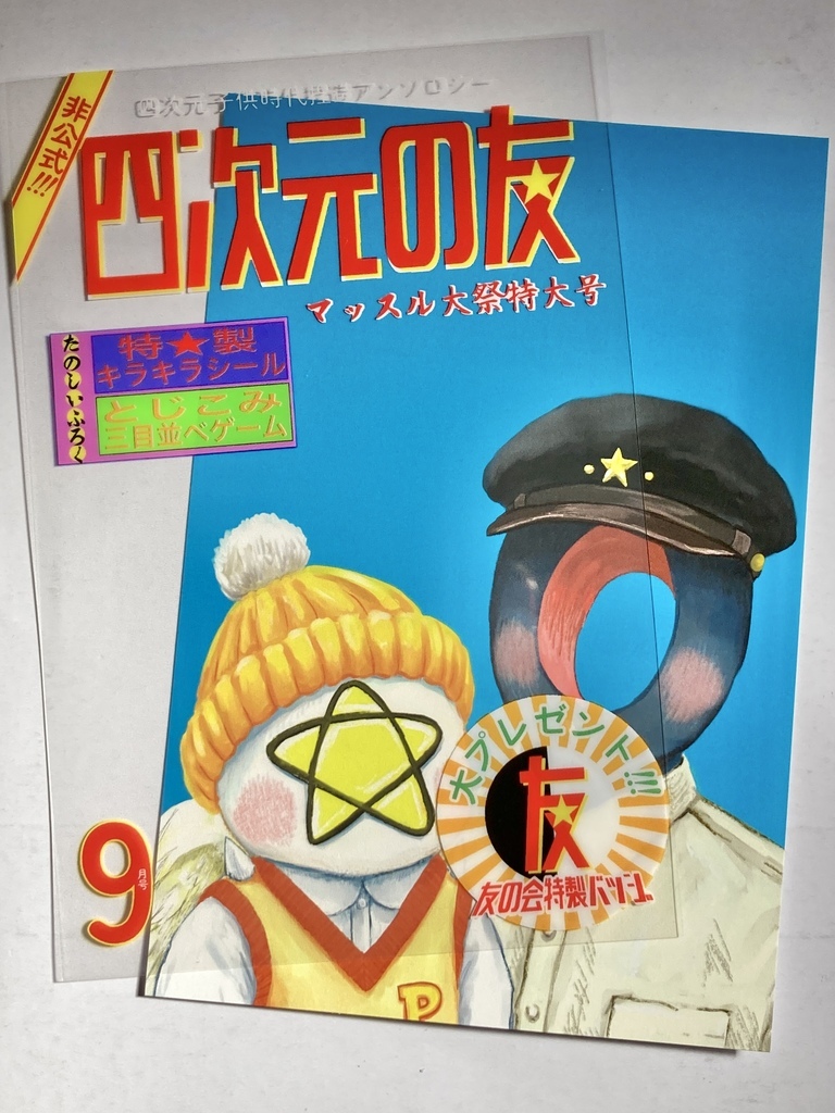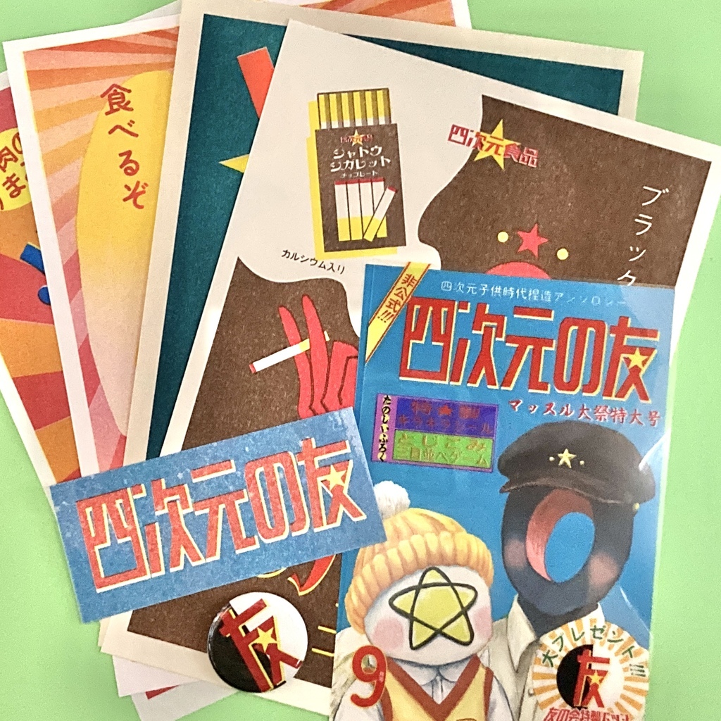 セット内容 アンソロジー 「四次元の友」 A5サイズ フルカラー108ページ 付録…ステッカー、缶バッジ 「四次元レトロポスターセット」 A5サイズ4枚 「レイヤードカードセット」 透明カードとイラストカードのセット