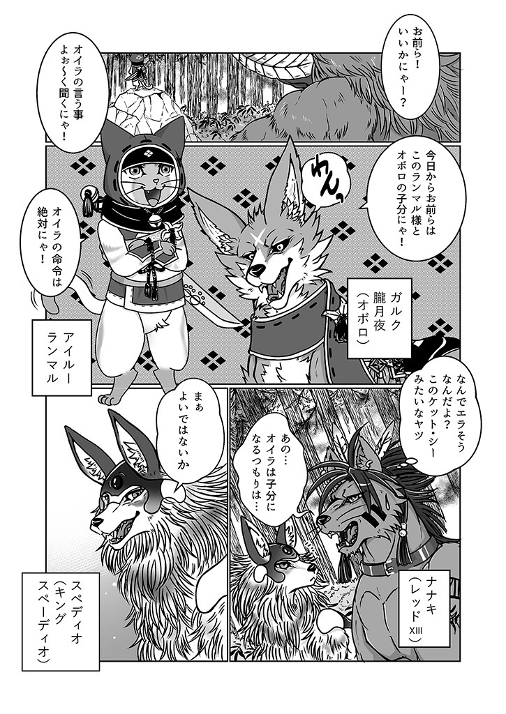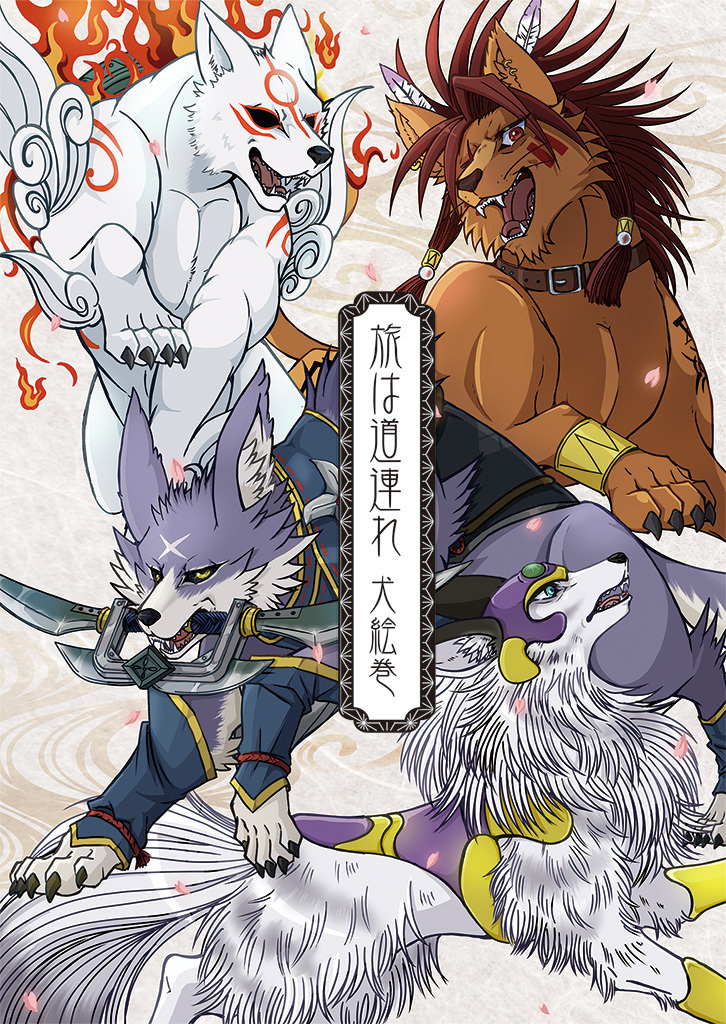 大神 アマテラス、モンハン ガルク&アイルー、FF7 ナナキ、ドラゴンクエストモンスターズ キングスペーディオの四つ足ケモノ中心のクロスオーバー本です。