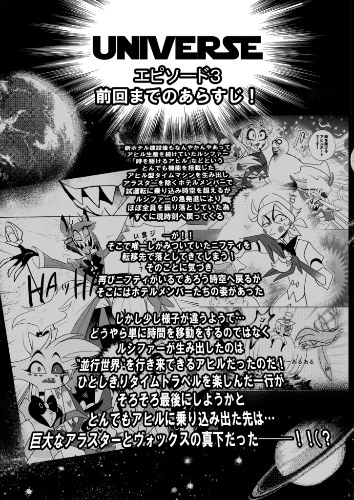 <内容> ルシファーがとんでも機能を積んだアヒルを作り出し、ホテルメンバーと共に 時空を超えてドタバタするマンガです。 続き物となっており、既刊のUNIVERSE1、2の続編となり今回の3巻で完結となります。これまではコメディーやギャグ要素中心で描いておりましたが少し後半にシリアス要素が含まれます。 また、自身の発行した既刊のCOMEDY‼の内容を引用している内容がございます。そちらの情報がなくとも問題なくお読みいただけるよう構成したつもりではありますが、ご了承の上お楽しみいただけましたら幸いです。 (パイロット版までの内容でそちらは描いていたため、P版ルシファーの人となりは想像で描いておりました。) <その他諸注意> introduction この作品はハズビンホテルのファンアート作品です。 アマプラ1期公開後の情報をもとに発想を膨らませて描いております。 今回ギャグ傾向の作品となっている為、かなり各キャラクター のキャラ崩壊度が強いですが、同作者の作品としても 1つの創作物として切り離してお読みいただけたら幸いです。 カップリング作品ではありませんが、 原作程度のキャラクター同士の距離の近さがございます。 上記をご了承の上 お楽しみいただけたら幸いです。 ★この本は個人的に製作された非公式ファンブックです。 公式原作者様、実在の人物様とは一切関係ありません。 ★無断転載・複製・複写・Web上への掲載 (SNS・ネットオークション・フリマアプリ含む)は禁止です。