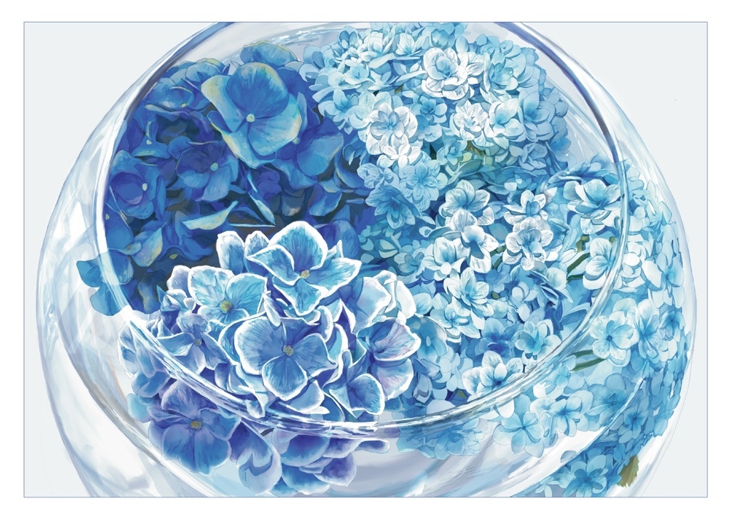 異なる青のアジサイが3種活けられていた様子が綺麗でした。