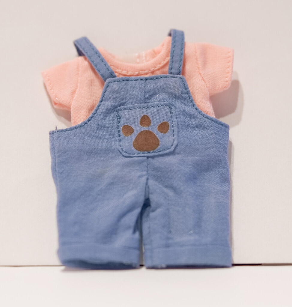 肉球のアップリケ付きオーバーオールです。