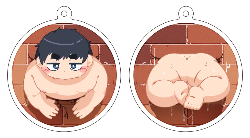 ヒトあきらが裸で壁にハマっちゃった!な両面アクリルキーホルダーです。
