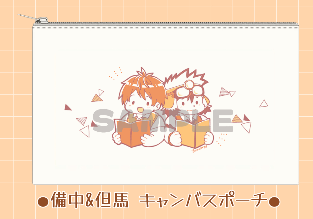 ブラウザゲーム「魂これ」に登場する備中くんと但馬くんが読書を楽しむイラストがプリントされたキャンバスポーチになります。