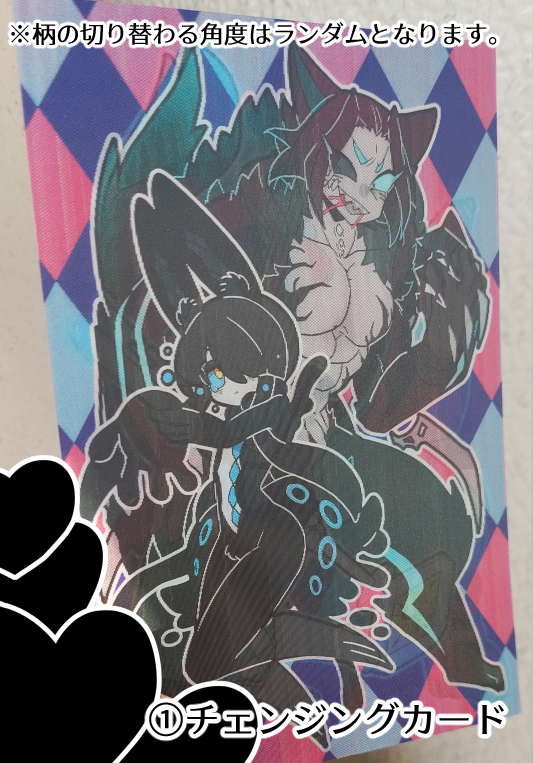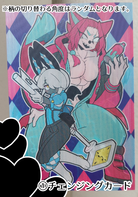 「①チェンジングカード」は1枚で2柄が切り替わるレンチキュラー仕様です。形態変化する2人の姿を楽しめます。