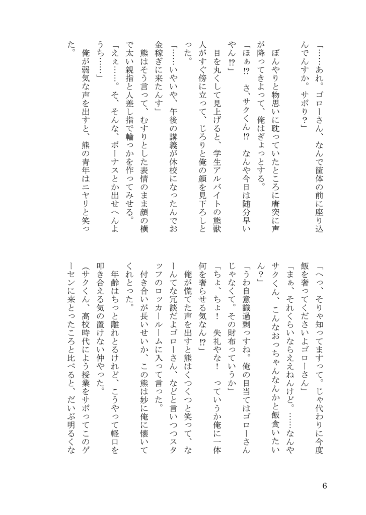 地方の小さなゲームセンターの店長を継いだ猪崎吾郎は三十路の猪獣人。ある時、彼は高校生に成長した熊獣人・松隈朔太郎と再会する。アルバイトとしてゲームセンターに出入りするようになった朔太郎に、吾郎はごまかしきれない感情を自覚するようになって──。 合同誌などに寄稿した短編や中編に書き下ろし作品を加えた連作集です。 関西けもケット11にて頒布 ゲストイラスト:たかさき けいいち