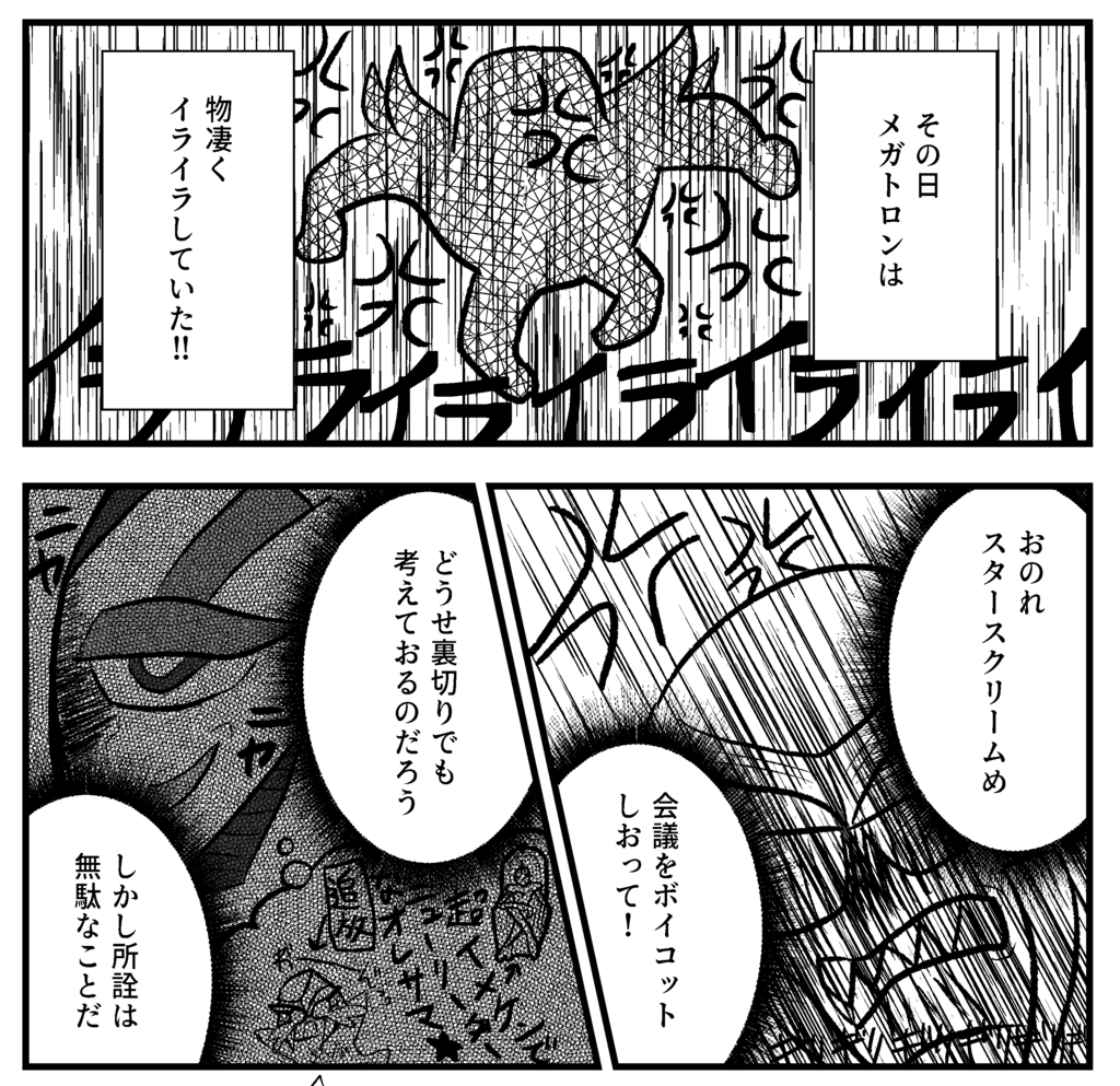 会議をサボったスタスクを叱るため、 スタスクの部屋に向かったメガトロン。 しかし、そこにいたのは もちもちのスタスクだった! 「どうしてこんなことになったのか?」 「いったい誰がこんなことを!?」 「スタスクは元に戻れるのか!?」 「むしろ戻らなくてもよくないか?」 等々の思考を── メガトロンは一切しなかった!! 優秀だが問題児である メディックノックアウトが犯人だと 決めつけたのだ!!! ……といった内容の平和なプライム本です。