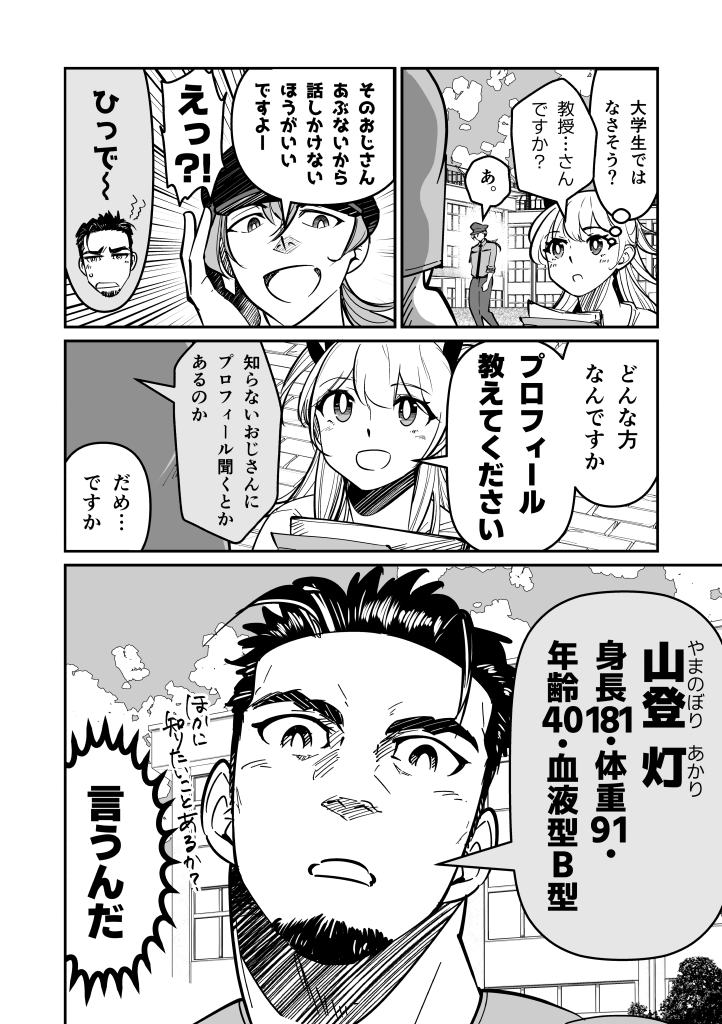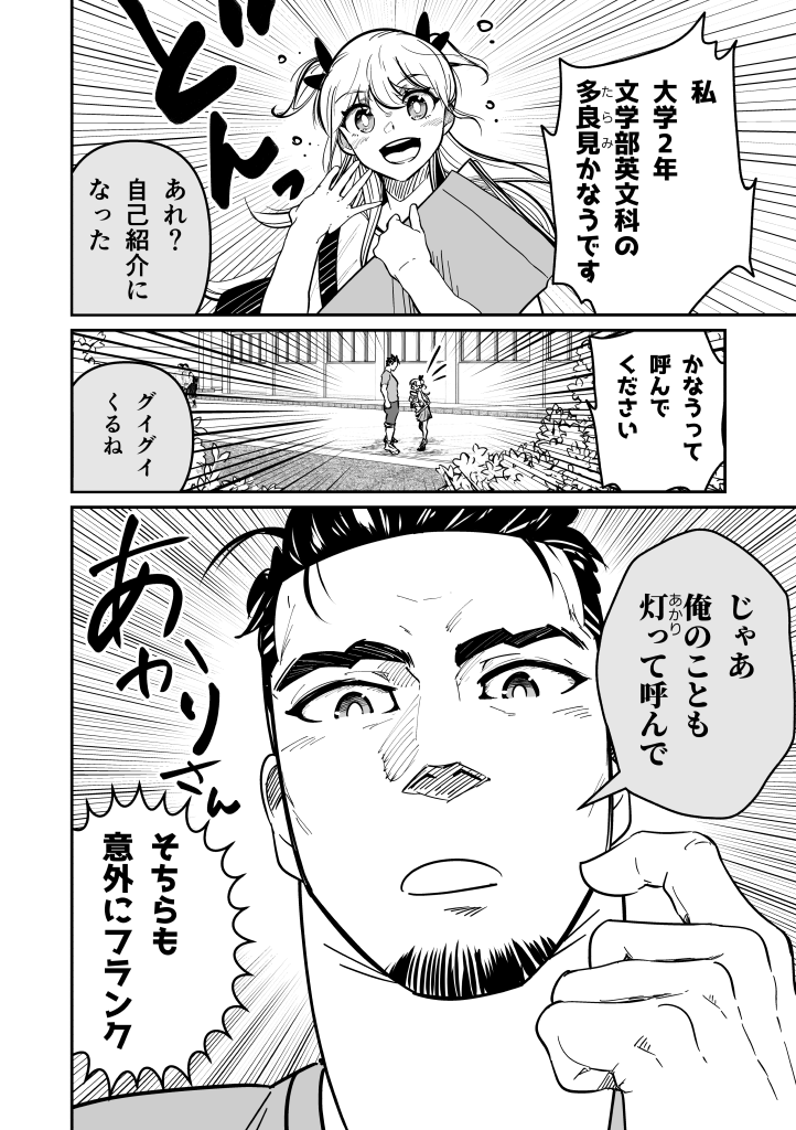 (学生でもないし教授でもないしこのヒトはいったい…?)とかなうが疑問に思い喋りかけると、彼は40歳、名前は「灯(あかり)」だと分かった。淡々と喋り、マイペースで素性が見えない彼・灯に好奇心が広がっていくかなう。