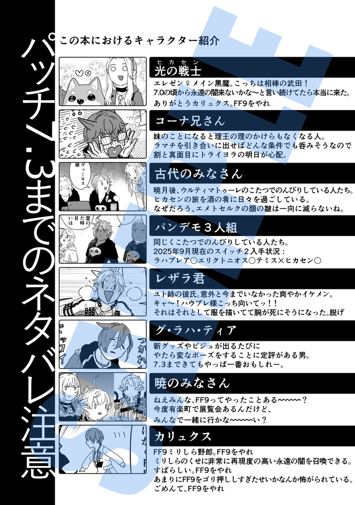 https://lit.link/shinaki14を楽しく遊ぶヒカセンとNPCたちの本です。A5/52p/うち描き下ろし15p。パッチ7.3までのネタバレがあるのでご注意ください。