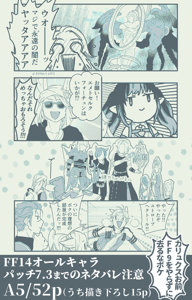 14を楽しく遊ぶヒカセンとNPCたちの本です。A5/52p/うち描き下ろし15p。パッチ7.3までのネタバレがあるのでご注意ください。