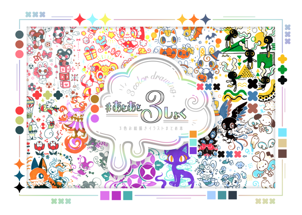 AtAtがSNSで投稿している3色縛りのお絵描き企画【 #あとあと3しょく 】のイラストまとめ本です。