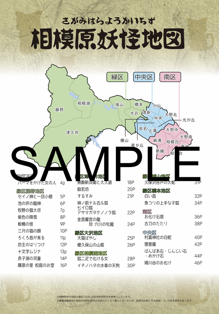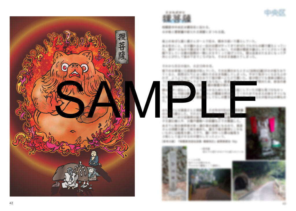 個展「相模原の妖怪展」を記念して製作したフルカラー図録。 展示する相模原妖怪30体をすべて収録。 イラスト集、民話・伝説の収録集の両面からおたのしみいただけます。 【掲載内容】 ・もくじ ・はじめに ・相模原各地の妖怪30体のイラストと解説 ・あとがき ・大蛇堂プロフィール ・参考文献一覧 【現地写真掲載】 赤子淵の河童、篠原の里 校庭のお堂、お化け石塔、古刀のたたり、村富神社の白蛇、狸菩薩、ばんばあ石・じんじい石・めかけ石 【掲載妖怪】 ・地区不明 パーマをかけた女の人 ・緑区藤野地区 セイノ神と一つ目小僧、池の坪の龍神、牧野の猫大尽、紫色の降雪、板橋の怪、三尺の猫の顔、ろくろ首が来る、坊主のはりつけ、十文字ムジナ、赤子淵の河童、篠原の里 校庭のお堂 ・緑区津久井地区 無敵新兵衛と大入道、般若坊、するすみ、神ノ前ナル古ル狐・七イロ狐・アサマガタケノノラ狐、金毘羅宮の龍 対 穴川の牝龍 ・緑区大沢地区 大猫ばやし、榎久保の山姫 ・緑区相模湖地区 狐二疋で化ける女、イチノハタの水車の天狗 ・緑区城山地区 久保沢谷戸の大蛇 ・緑区橋本地区 白い首、魚つりの上手な子狐 ・南区 お化け石塔、古刀のたたり ・中央区 村富神社の白蛇、狸菩薩、ばんばあ石・じんじい石・めかけ石、鳩川谷のお化け