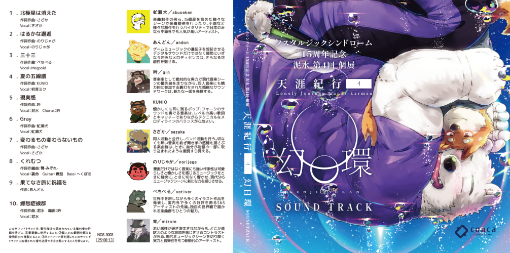 2025 ノスタルジックシンドローム 泥水個展 「天涯紀行-イ- 幻日環」 会場BGMのサウンドトラックです。 ダウンロードカード形式です、海外ではアクセスできない国がありますのではじめにご確認ください。 https://conca.cc/faq ▢虻瀬犬 @kenkoudaiichine ▢あんどん @andondon123 ▢吟 @tanukilab ▢KUNIO @tanutanukick ▢さざか @xzk_ ▢のりじゃが @norijaga ▢べちべる @vetiver_n ▢霄 @mz0re クロスフェード動画↓ https://www.youtube.com/watch?v=PP-MAhJPc0Y 特設サイト↓ https://xfolio.jp/portfolio/doromiez/free/1138907