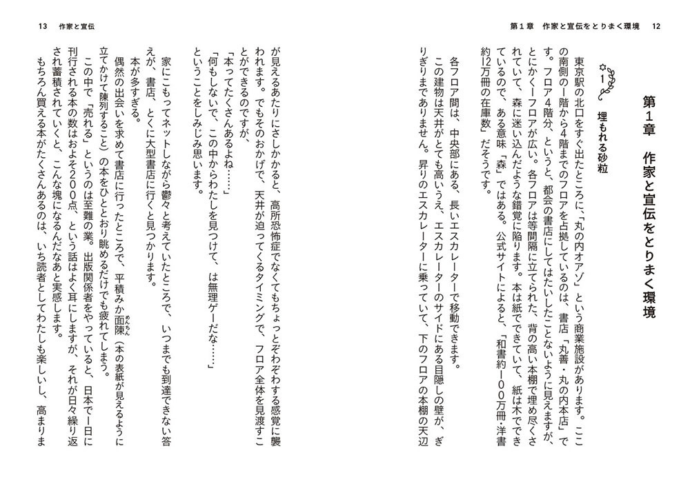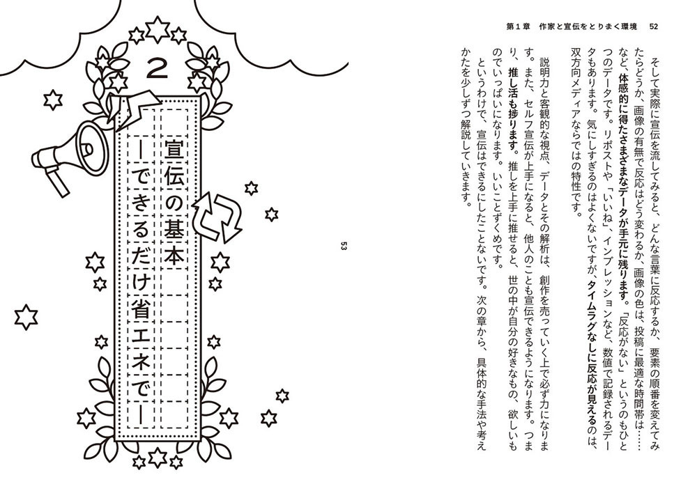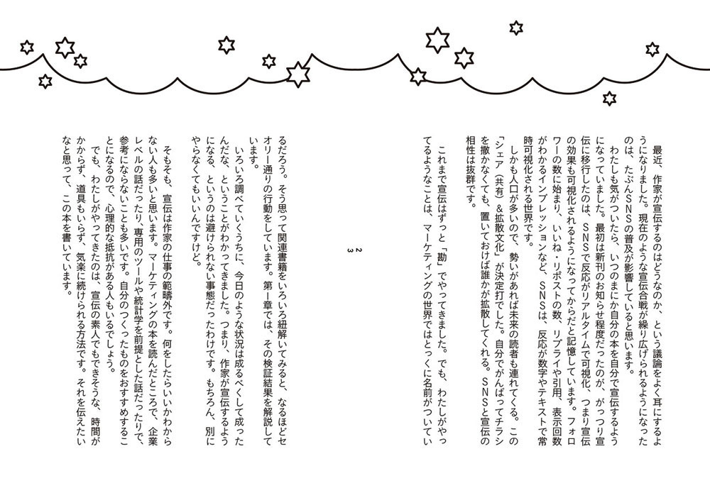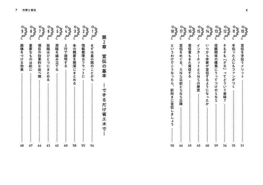 作家が宣伝までするようになったのはいつからか、その経緯を紐解きながら、宣伝の意味やその効果を解説しています。さらに、おもにSNSを中心とした、気負わずに長続きする宣伝方法や、見てもらいやすい宣伝のつくりかた、その他宣伝アイデアをまとめました。自分の本の存在を知ってもらうにはどうしたらいいか、ということが自然とわかるようになると思います。