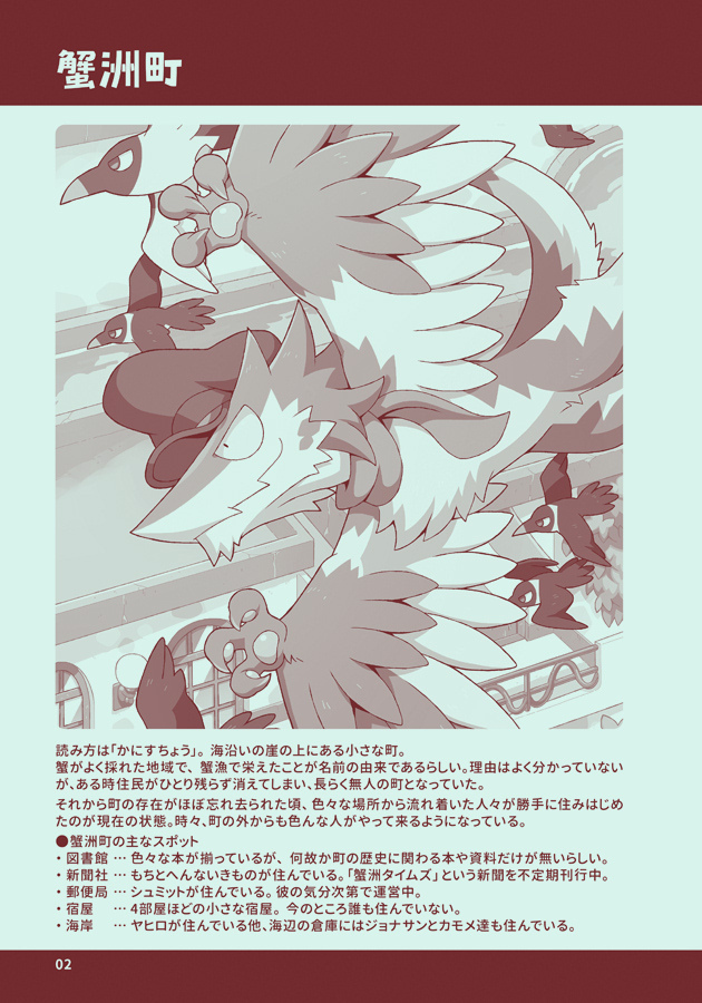 「蟹洲町のみなさまがた」「ベオとカタリナ」の 世界観とキャラクターの簡単な紹介本です。 漫画の内容より少し深堀りした情報などを載せています。 ◆本文印刷:ききょう色 本文用紙:あさぎ色 ※サンプル画像の色味は参考です。(現物とはやや異なります)