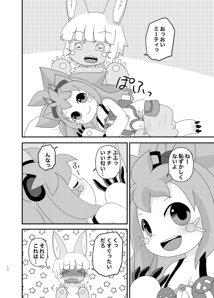 ファプタにヤキモチをやいたナナチにミーティが膝まくらをしたりされたりするお話です
