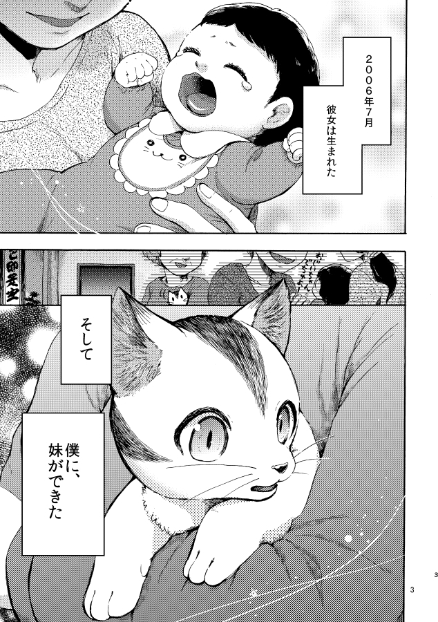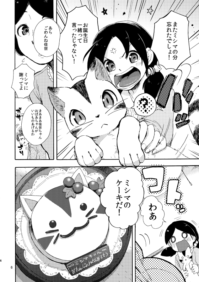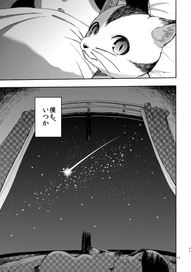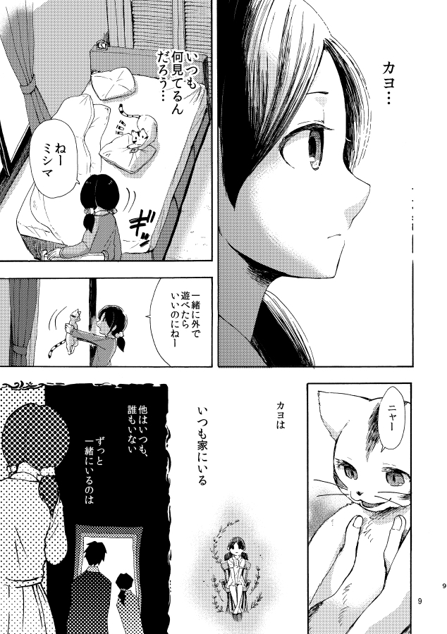 商業誌デビュー作「願いを叶えた猫」をまとめた本です。 内容は雑誌に掲載されたものと全く同じものです。 飼い猫・ミシマは、家族の少女・カヨを妹のように想っていた。 孤独なカヨを守りたいミシマは、流れ星に「人間になりたい」と願う。 そこからミシマは、環境は、周りは、変化していく…。 講談社ヤングマガジン・2015年11号に掲載された、商業誌デビュー作を本にした同人誌です。紙でほしい方向け。 過去web掲載したイラストの、フルカラー口絵が1ページ入っています。 オマケとして、描き下ろしのあとがきマンガが4ページ収録されています。
