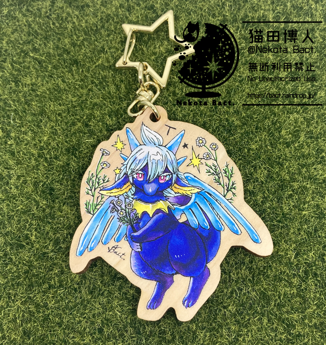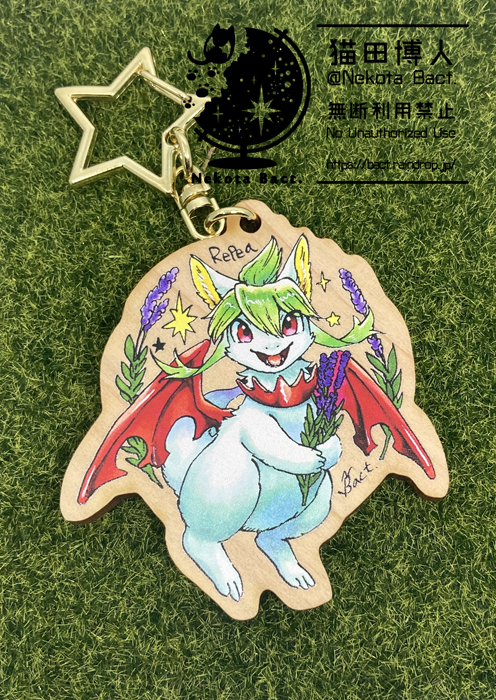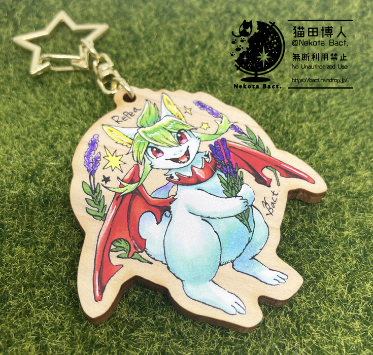 https://bact.raindrop.jp/創作マンガ「プレアデスの両脚」「転生竜は此を願う」の、リペアとティーが片面ずつに印刷されたウッドキーホルダーです。