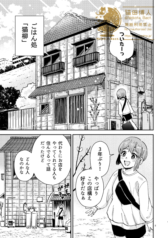 https://bact.raindrop.jp/将来に迷う少女・スズと、「猫になる病」を患っている料理人・ヤナギの、出会いと心温まる読切。