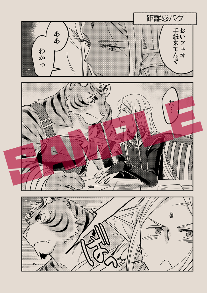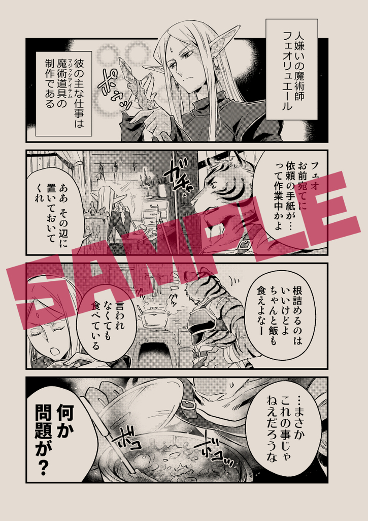 TwitterやPixivにてアップした虎エルフネタ(面倒見のいい虎獣人の傭兵ロア×人嫌いエルフ魔術師フェオリュエール)の小ネタ漫画を、時系列などを考慮し編集しなおした一冊となります。