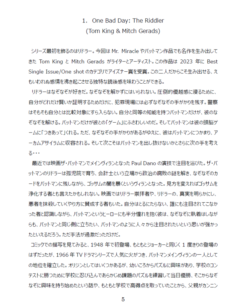 https://sylphy-bat.tumblr.com/文学フリマの新刊として出した、Batman: One Bad Dayのバットマンコミックレビュー本です。2022年に発売された8人のヴィランにフォーカスが当たったシリーズ。昨年には「バットマン:ワンバッドデイ」として一部邦訳されています。それぞれのヴィランの歴史を振り返りながら各作品のレビューを行っているので、ぜひコミックのお供に。