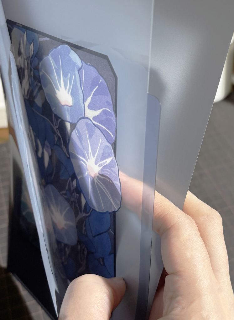 表面の絵柄背景部分が透明になっており、仕切りの手前に入れると透明部分から見え、奥に入れると見えなくなります。