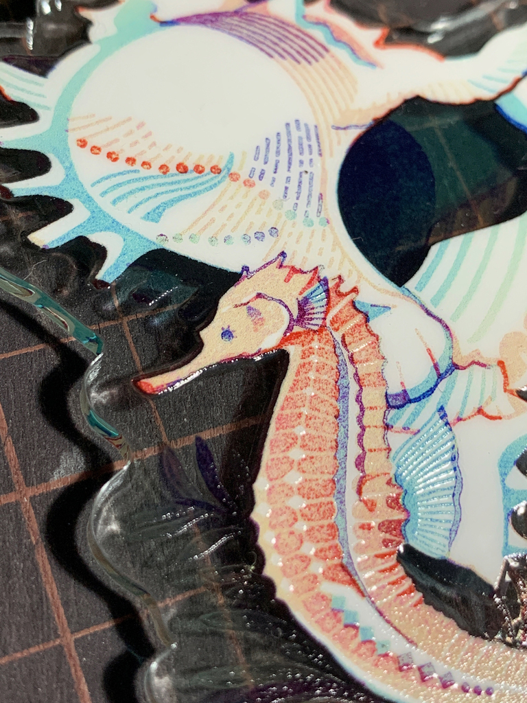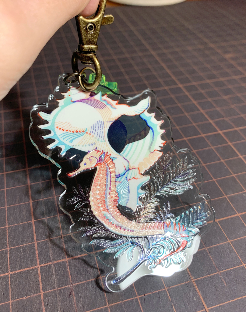 【素材・プリント】薄く水色がかった透明アクリル、薄く黄緑がかった透明アクリル(チャーム部分)、非光沢グロス(表面保護)、光沢グロス