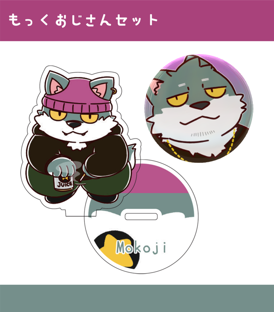 ケモVさんのお出かけアクスタ&カンバッジのセット(もっくおじさんver)です