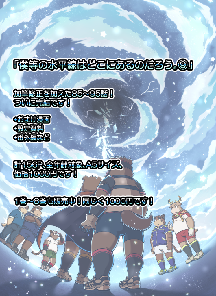 2020年4月からTwitter、pixivにて連載しております 「僕等の水平線はどこにあるのだろう。」のまとめ本9巻です。 ついに最終巻です! 加筆修正を加えた85~95話を収録の他、 番外編漫画、おまけ漫画、設定資料なども収録しています! 156Pの大ボリュームです! 1巻はこちら→https://alice-books.com/item/show/7339-6