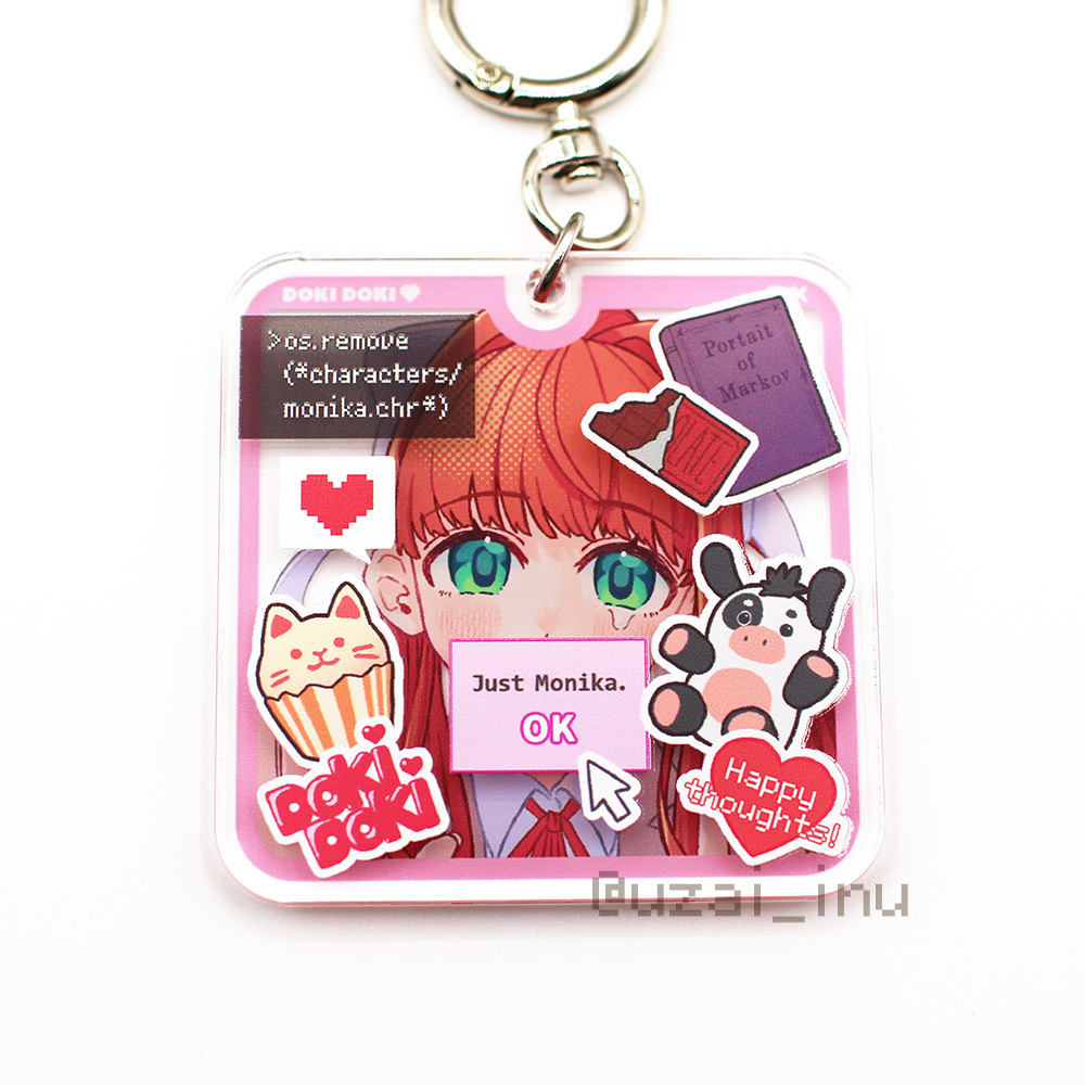 https://twitter.com/uzai_inuウィンドウに閉じ込められたモニカの2層印刷アクリルキーホルダーです。