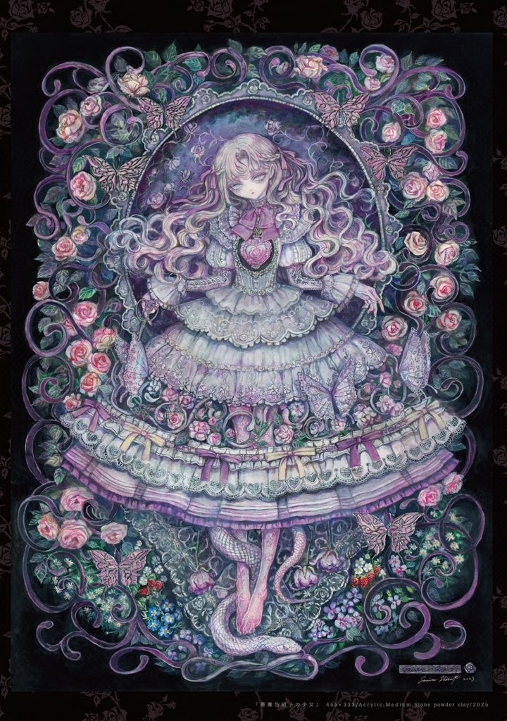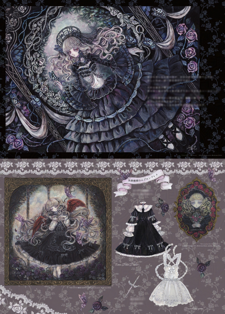 https://twitter.com/sumireshiseiガーデン×ゴシックをテーマとした、ファッションに焦点を当てたアクリル画&テキストの本。